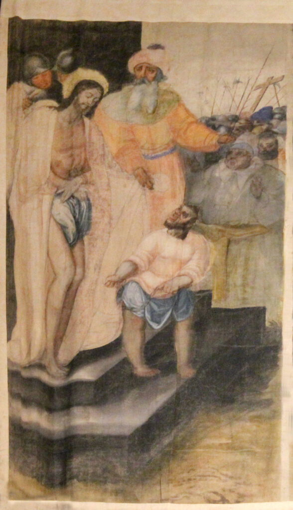Imagen de Jesús, coronado de espinas, con su manto, rodeado por sus torturadores: soldados y sumos sacerdotes, siguiendo el imaginario iconográfico propio de la época, que se puede encontrar en otras obras italianas del s.XVII