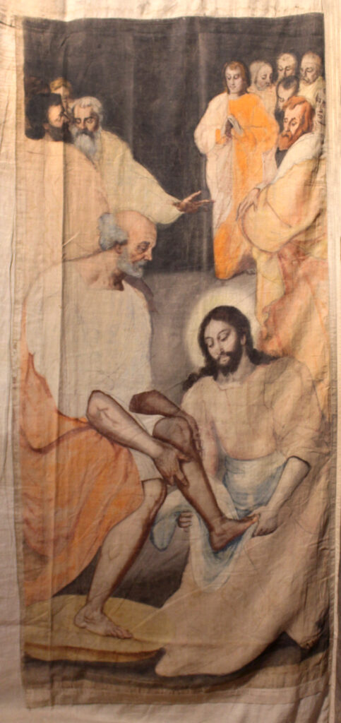 La escena representa a Jesús lavando los pies de sus discípulos como un signo de humildad y también de purificación antes de instituir la Eucaristía de la Última Cena, reflejada en el evangelio de San Juan. La parte central de la imagen la ocupan Jesús lavando los pies a Pedro, vencidas sus reticencias iniciales. Al fondo, se disponen el resto de los apóstoles en composición abierta, asimétrica y logrando una perspectiva lineal por la superposición de personajes con la puerta al fondo como punto de fuga. Resulta inevitable la mención de “El lavatorio”, una de las más reconocidas obras pintada apenas 20 años antes por Tintoretto, el gran pintor manierista veneciano y uno de los referentes de Martín de Vos, que se expone en el Museo del Prado, aún cuando le ejecución técnica de la Sarga no sea equiparable.