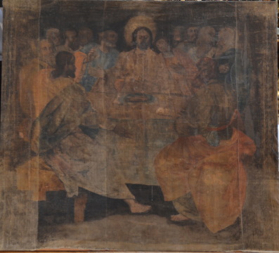 Esta escena es la única que no se muestra dentro del conjunto general de la Sarga. Se puede ver extraída de la misma en un cuadro que se muestra en el interior del acceso lateral a la iglesia, que fue acceso principal en el primitivo templo románico sobre el que se levanta. Muestra el episodio de la Santa Cena -que no la última- en la que se instauró la Eucaristía y en la que se produjo la premonición de la traición de Judas. En su día situada justo encima del altar mayor, fue el fragmento que más hubo de soportar los efectos del calor y los humos de los cirios y, por tanto, aquel en el que eran más evidentes los signos de deterioro ya que, a la general decoloración y efectos de la humedad y de hongos, se unía en este caso la descomposición del soporte en algunas zonas. Por ello, se hubo de proceder a un reentelado, debido a la fragilidad que presentaba el soporte. A pesar del gran esfuerzo realizado es el fragmento que muestra un estado de mayor deterioro.