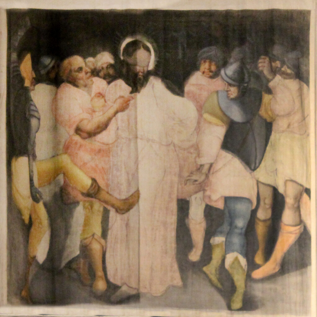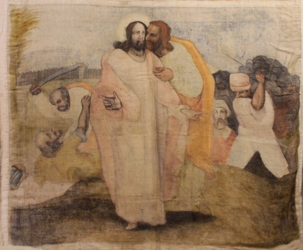 Judas, tras guiar a los guardias del Sanedrín al huerto de Getsemaní, delata a su maestro por 30 monedas de plata con la señal convenida de un beso, traición ya anunciada por Jesús en la Última Cena. En el caso de Judas, se adivina en su vestimenta el amarillo, color que simbolizaba la traición en la teología medieval. A la izquierda, San Pedro le corta la oreja a uno de los siervos que colaboró en el arresto de Jesús. Al fondo a la derecha, comienza un enfrentamiento con espadas y palos. Nótese cómo las escenas del fondo, marcadas por la acción, la violencia y el dramatismo, contrastan con la serenidad de los dos protagonistas en primer plano, que casi parecen estáticos.