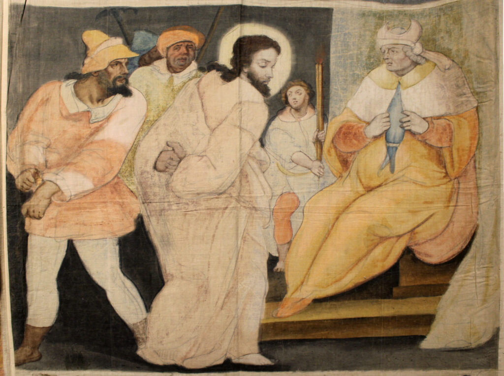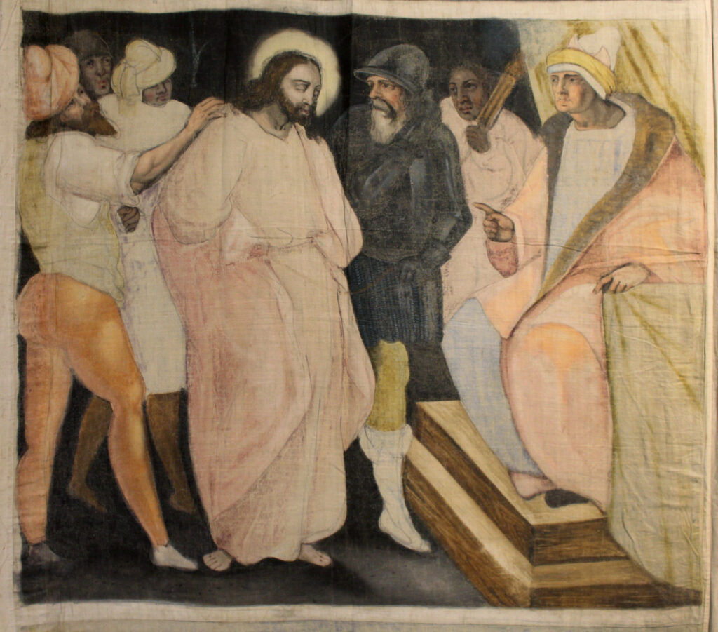 Cristo, en la zona central de la escena ligeramente desplazado a la izquierda, es llevado por unos soldados ante el sumo sacerdote Caifás, quien aparece en su palacio sentado en el trono cubierto por un baldaquino, rodeado por el sanedrín, consejo de ancianos, y con los fariseos, seguidores religiosos que aparentaban rigor pero eludían los preceptos y el espíritu de la ley. El gesto de Caifás denota la ira del momento y, aunque tiene abiertas las vestiduras, no se refleja el gesto de arrancárselas como en otras representaciones del tema (Giotto). Uno de los soldados levanta una mano para golpear a Jesús, inmovilizado.