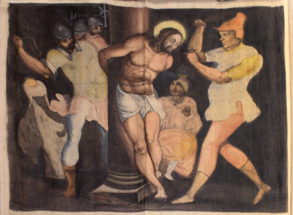 En una localización que se puede adivinar como el patio de un palacio, Cristo está atado en una columna rodeado por dos sayones que le flagelan. Al fondo a la izquierda se ven otros soldados romanos, mientras que a la derecha, a los pies del protagonista, parece adivinarse su túnica, de la que ha sido despojado. Completan la escena otros personajes que parecen contemplar el martirio. Se trata de una de las escenas en las que mejor se aprecia la influencia manierista en el tratamiento del cuerpo humano: la figura de Cristo se representa en una postura difícil y un tanto artificiosa, consiguiendo una extraña elegancia. La buscada desproporción de extremidades y cabeza y la estilización del semblante refuerzan la expresividad del episodio.