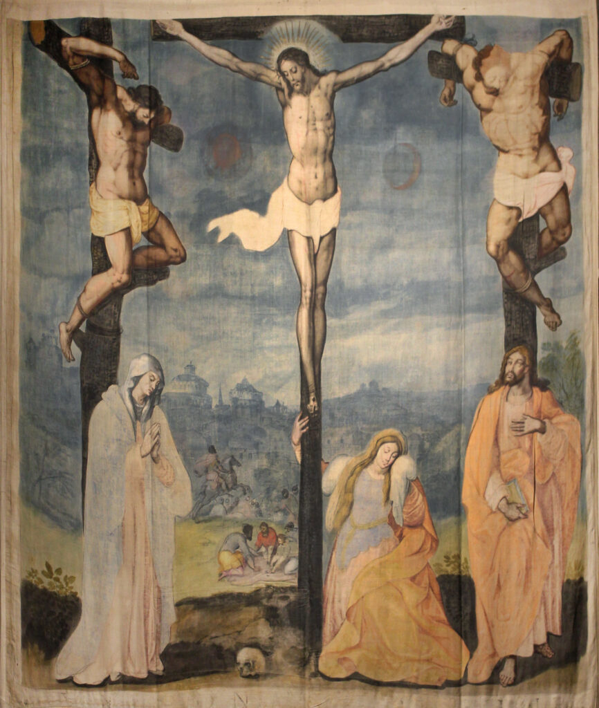 La escena central de la Pasión y de la Sarga incluye a los tres crucificados, a la Virgen , a San Juan y a María Magdalena, habitualmente arrodillada y abrazada a la cruz. También podemos ver, en muy segundo plano, a los soldados jugándose la túnica de Jesús, un paisaje urbano en la lejanía y un jinete que corre en su caballo hacia la ciudad. Técnicamente, es la mejor escena de la Sarga y presenta referencias artísticas suficientemente personalizados, con un dibujo subyacente muy preciso y una factura muy segura, rasgos artísticos que permitirían aventurar una hipótesis de atribución de la obra. Se dice de Martin de Vos que era un excelente dibujante pero un colorista seco, y esto lo podemos comprobar en el cuadro central de El Calvario. El Cristo, que sería propiamente de su pincel, se diferencia enormemente de los dos ladrones