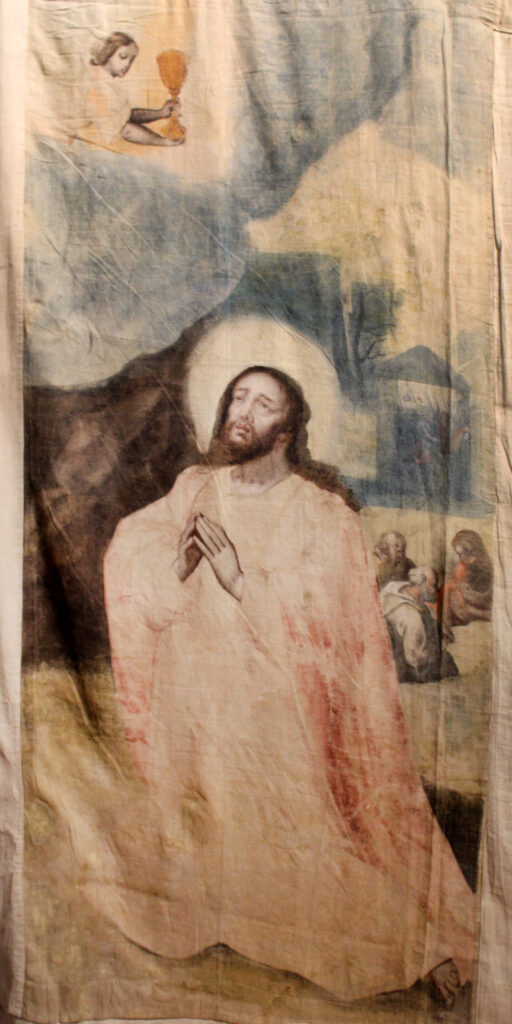 La oración en el monte de los Olivos es el episodio evangélico que antecede al prendimiento de Jesús y al inicio de su Pasión. Siguiendo las representaciones al uso, se sitúa a Jesús en el centro de la escena arrodillado y en oración, contemplando al ángel portador del cáliz. Entretanto, tres apóstoles -por el protagonismo que se les adjudica en los evangelios, cabría pensar que Pedro, Santiago y Juan- dormitan despreocupados en segundo plano. Se trata de una de las escenas más interesantes desde el punto de vista artístico, en tanto que contiene una de las más expresivas representaciones de Jesús y que permite apreciar el uso de técnicas que se empezaban a aplicar en la época, como el escorzo que se apunta en los apóstoles o la introducción de apuntes paisajísticos al fondo.